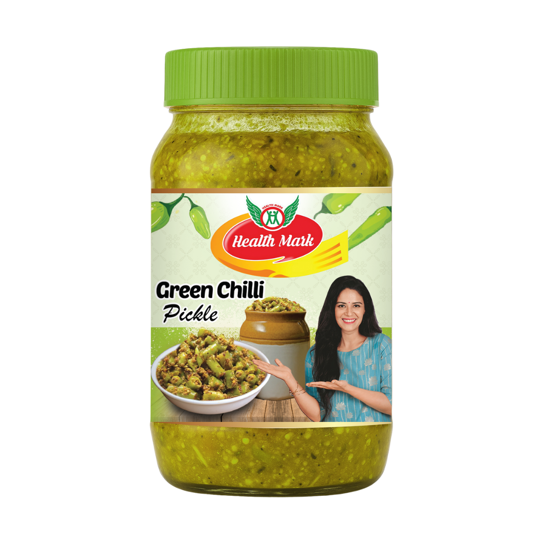 Health Mark Green Chilli Pickle—a spicy, tangy blend made from fresh green chillies and traditional spices, available in 400 g and 950 g packs to perfectly complement every meal.